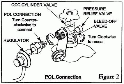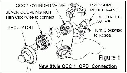 The QCC-1 uses a nut-and-nipple assembly and is easily recognized by the large, external right-hand threads on the cylinder valve.